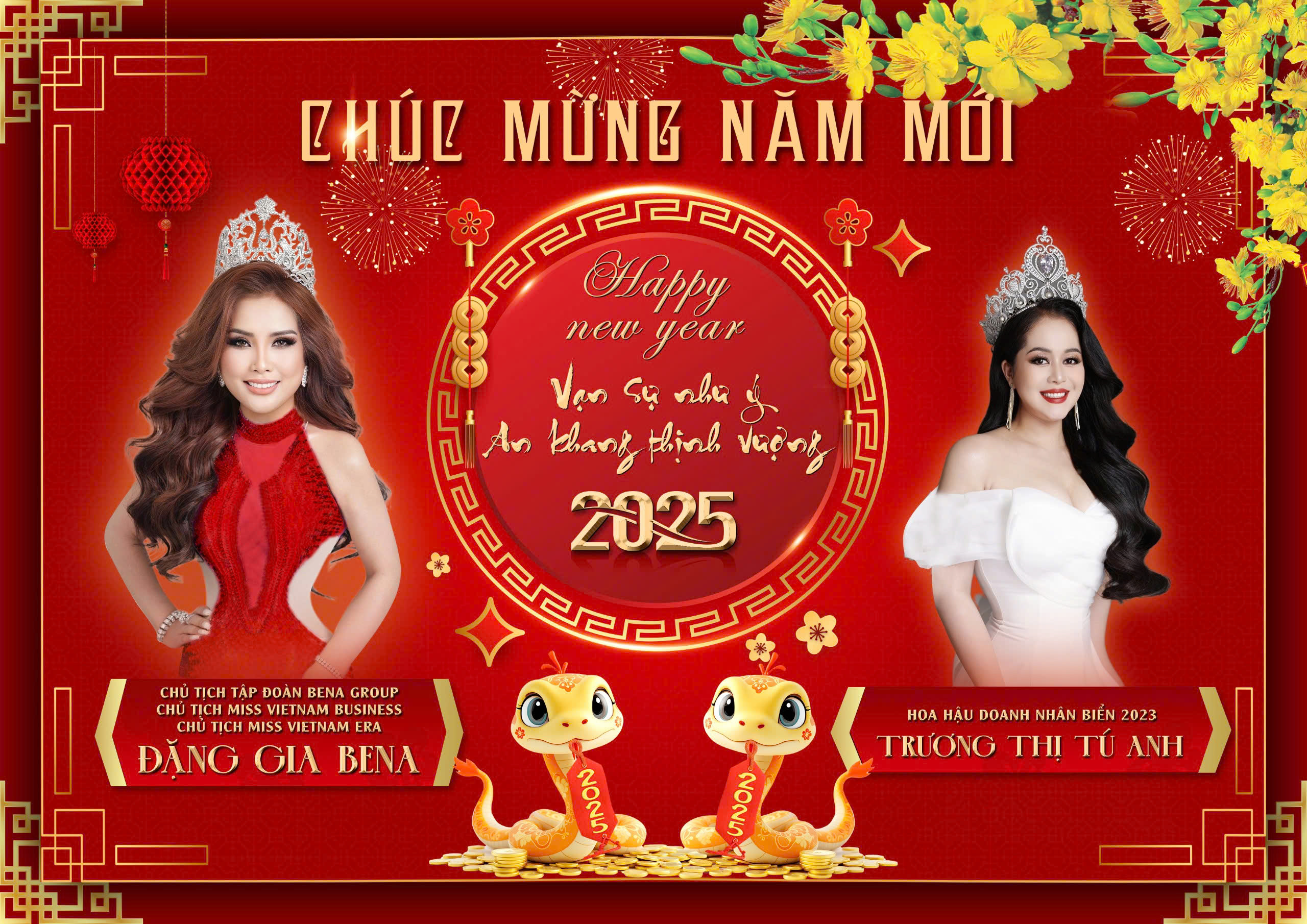 Trước thềm Tết Nguyên Đán Ất Tỵ 2025, Chủ tịch Miss Vietnam Business Đặng Gia Bena đã gửi những lời chúc mừng năm mới đầy ý nghĩa và tốt đẹp đến các Hoa hậu, Á hậu, Người đẹp và toàn thể các thí sinh của cuộc thi Hoa hậu Doanh nhân Biển 2023.
